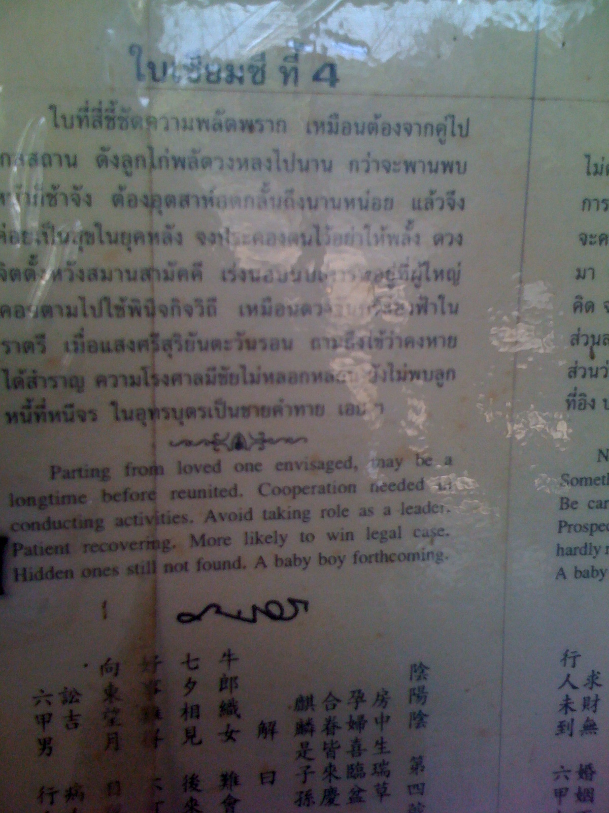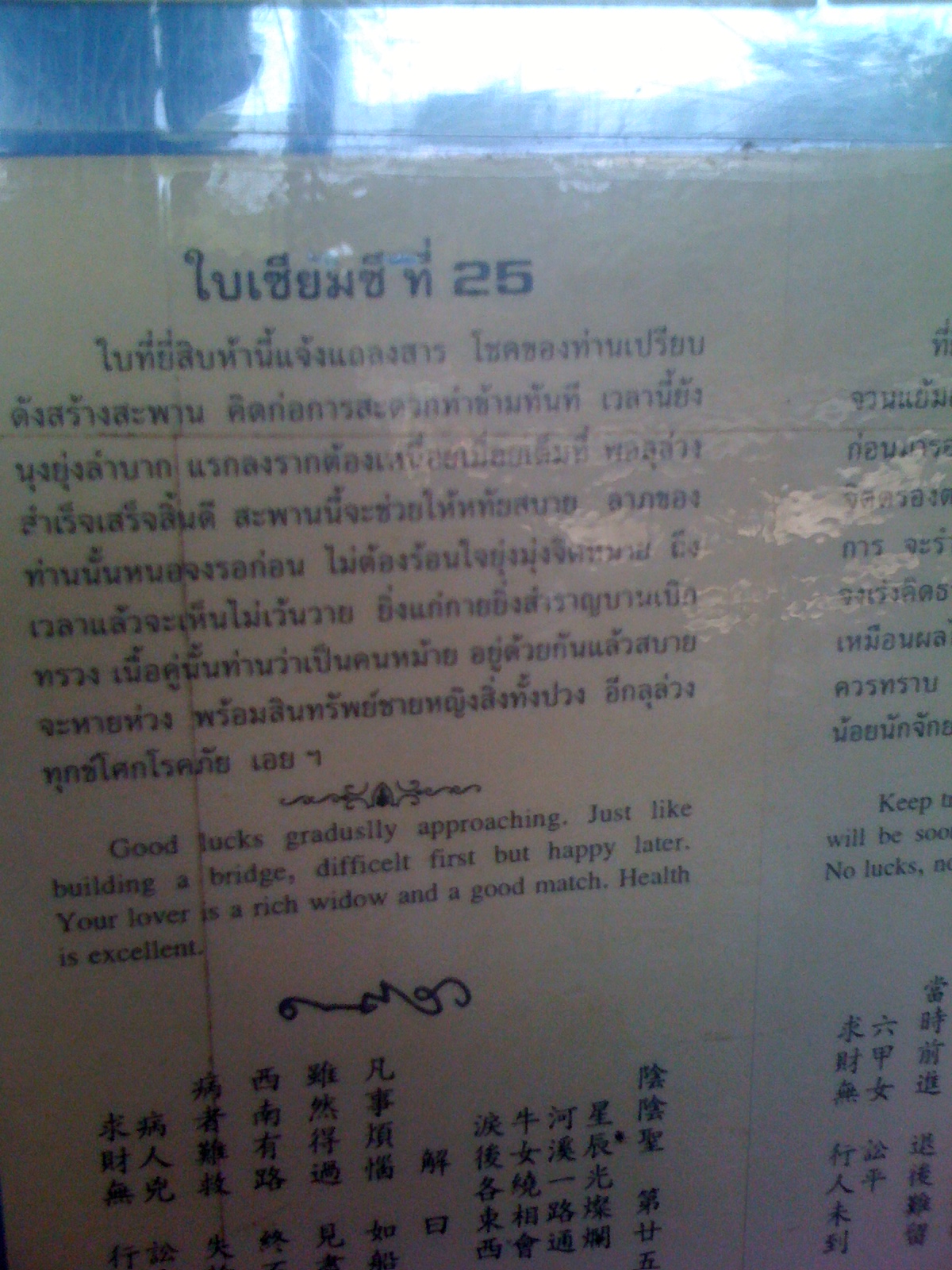 Etter at vi hadde tenkt noen ønsker til Budda ga han oss hver vår pinne med et tall på. På en stor tavle inne i tempelet kunne vi lese hvilke godheter Buda kommer til å gjøre for oss.