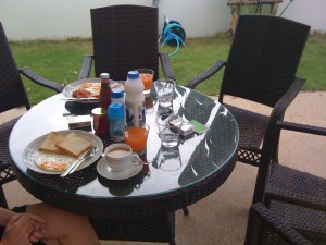 Beer og Oy kommer som avtalt klokken 09.00 og serverer oss en herlig frokost, det hjelper godt på formen!