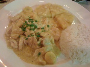 Vi bestemte oss for å spise middag før vi ville ut på fest. Sporty Ingvild som ikke er så happy for verken thaimat eller ananas valgte nettopp det.