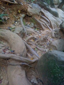 Vi måtte klarte over fallene trestammer, opp fjellskråninger og flere steder måtte vi holde oss fast i tau, greiner og andre tilgjengelige ting.