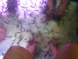 Men denne mannen er sta. Han insiterte på at vi skulle teste byens siste skrik innen spa – ”Fiskespa”.