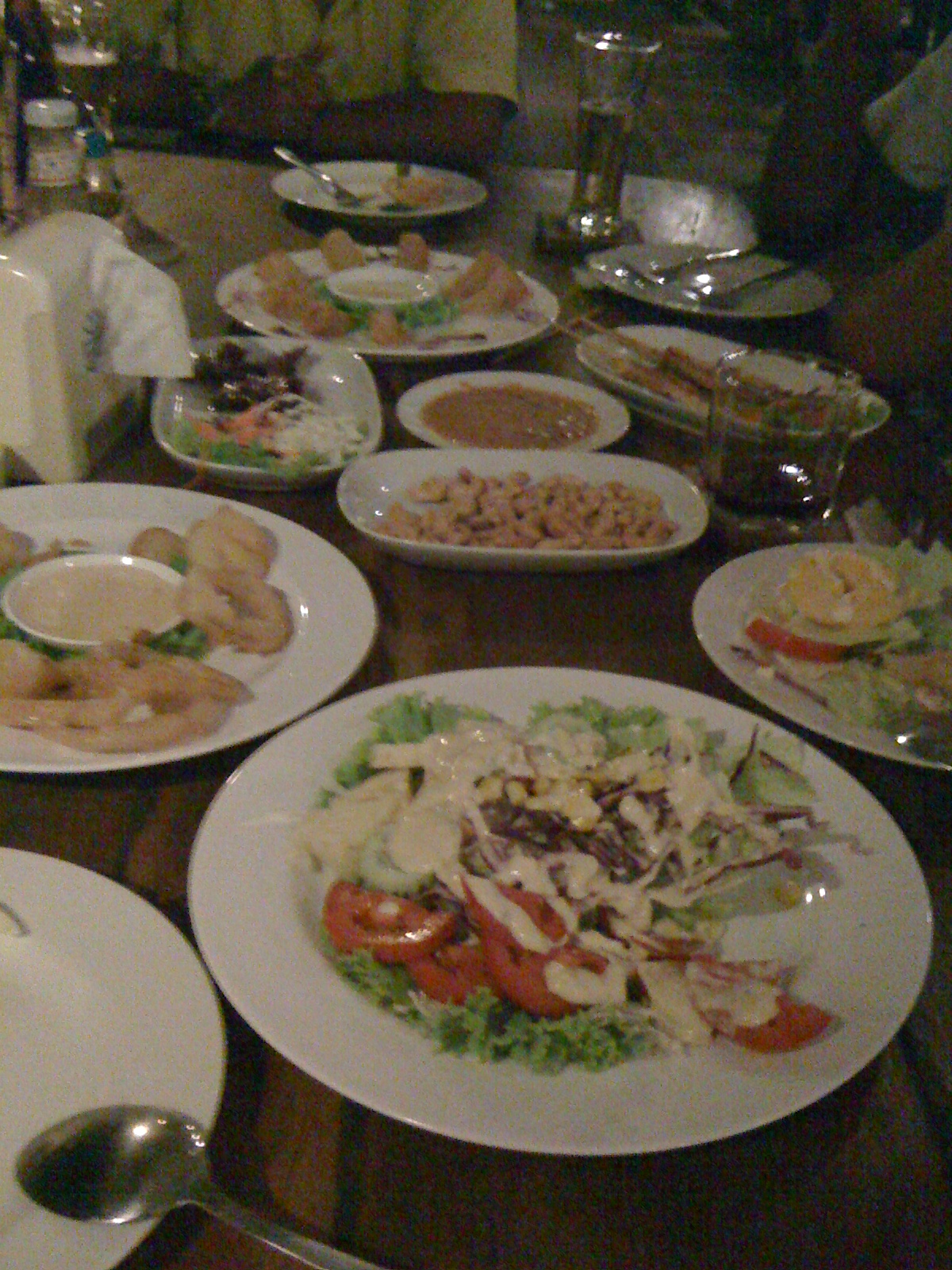 Alle fire dro vi på den lokale restauranten og vi bestemte oss for å bestille tahitapas til alle. I Thailand er de veldig beskjedene og ”har alltid spist” noe som selvsagt sjeldent er tilfellet. Det ble masse mat til alle. Rødvin, øl og mase skravling førte til at Rin og Pong inviterte oss med på en drink på den lokale baren KOOKAI.